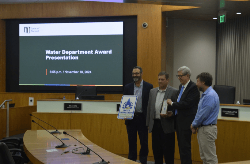 En otro orden de ideas, el alcalde de Normal, Chris Koos, aceptó el premio de embajador del agua de nivel oro de la Asociación Estadounidense de Obras Hidráulicas antes de la reunión.