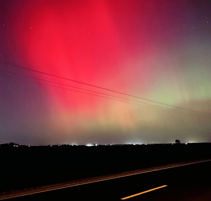 Las auroras boreales son un fenómeno natural que ocurre cuando partículas cargadas procedentes del Sol interactúan con el campo magnético de la Tierra, generando destellos de luz que suelen observarse en zonas polares. En ocasiones, tormentas solares particularmente fuertes permiten que estas luces aparezcan en regiones más al sur, como ocurrió esta semana en el centro de Illinois.